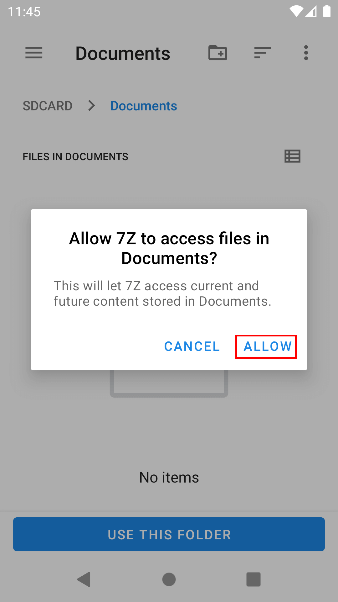 4. After tapping the button, 7Z will ask permission to access your chosen folder. Tap the Allow button.
