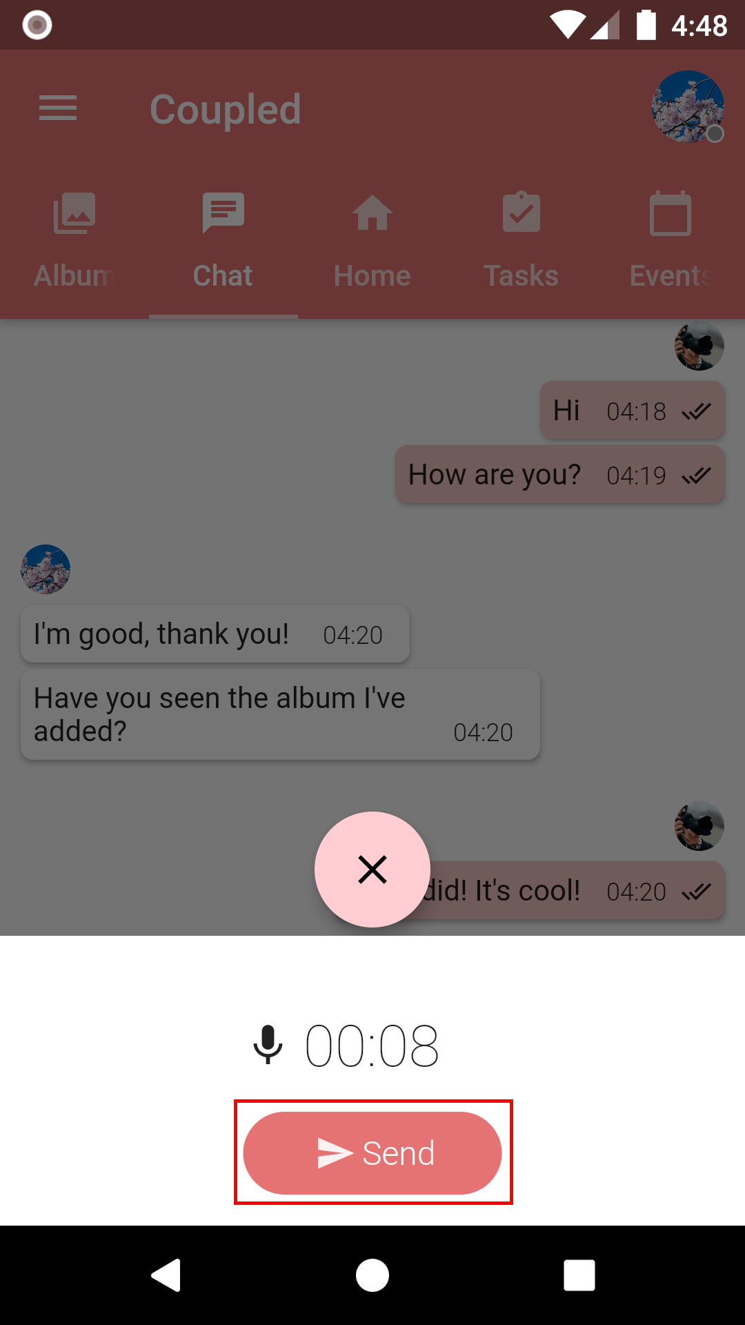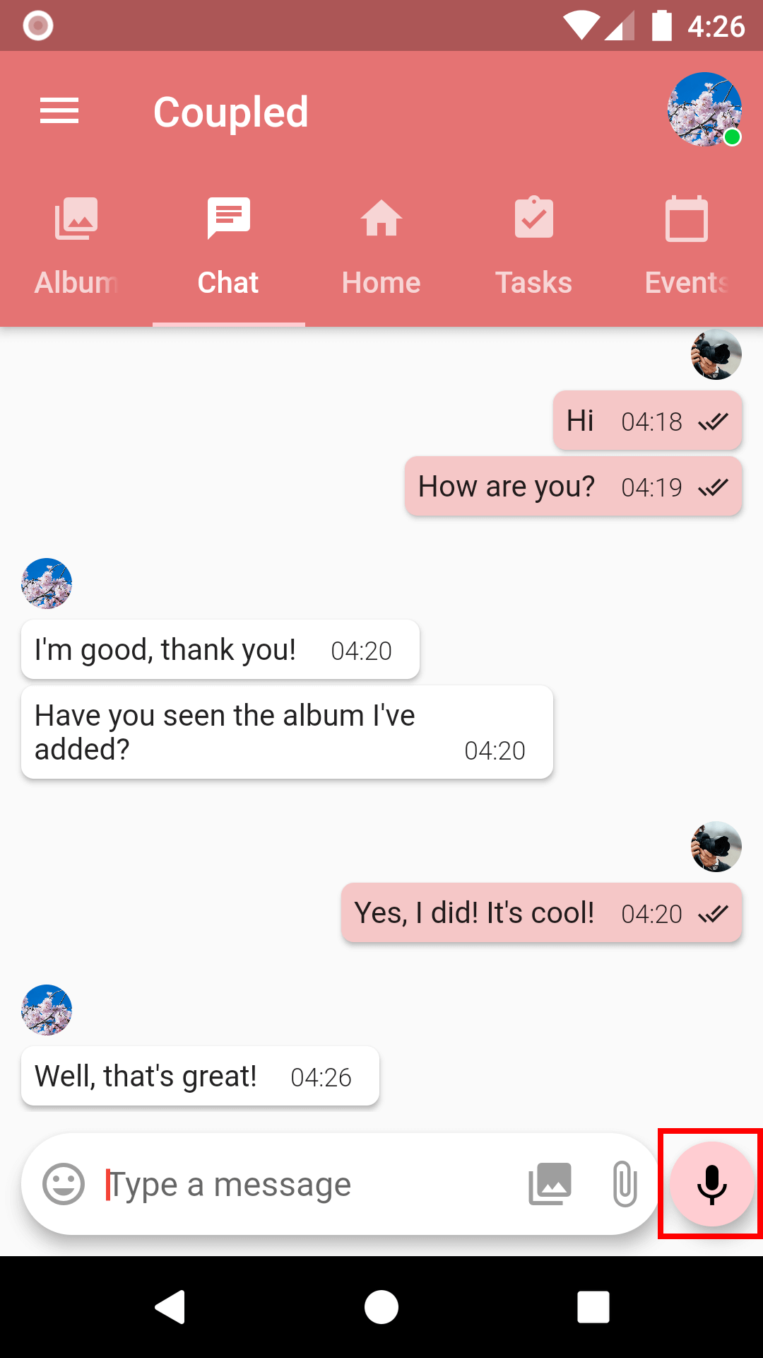 1. Tap the Chats tab or slide the Coupled screen to start using the chat feature.
