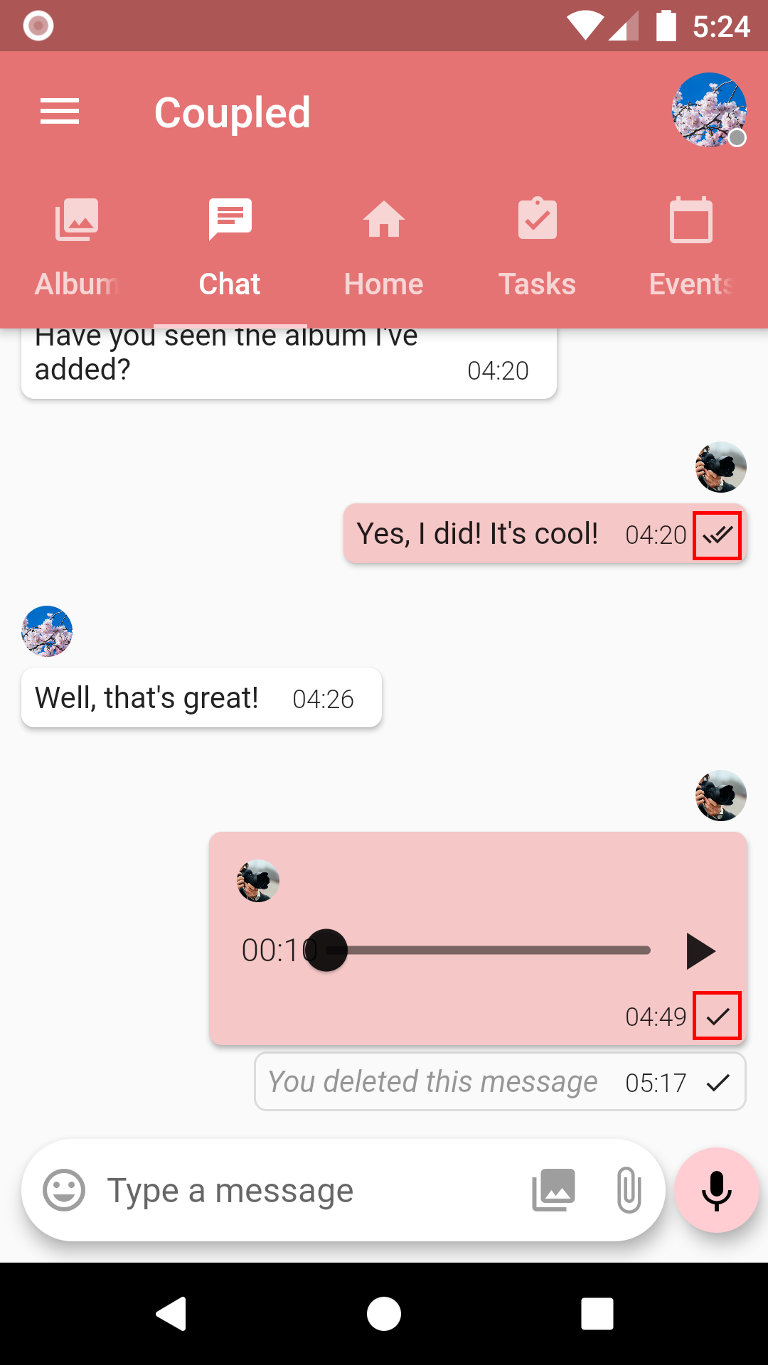 2. On the chat messages, you will be able to see the chat receipt icon. You will see a check icon if your message has been sent; this means that your partner hasn't been able to read it yet. A double-check icon will appear if your partner has been able to read it already.