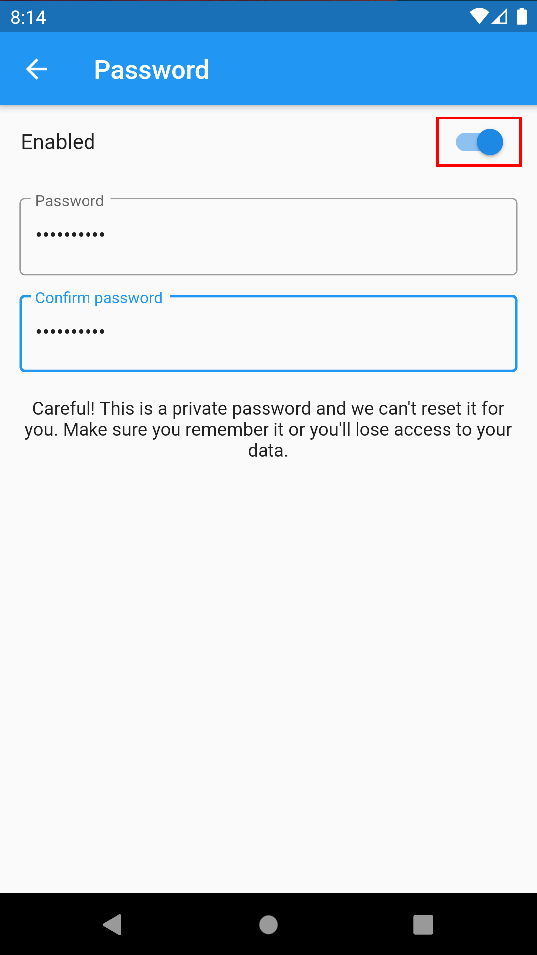 5. Switch the Enabled button, which will save your new password.