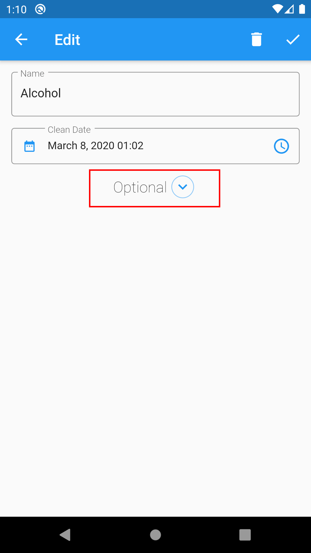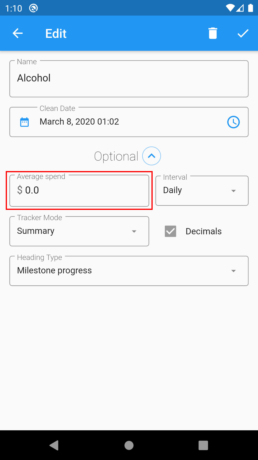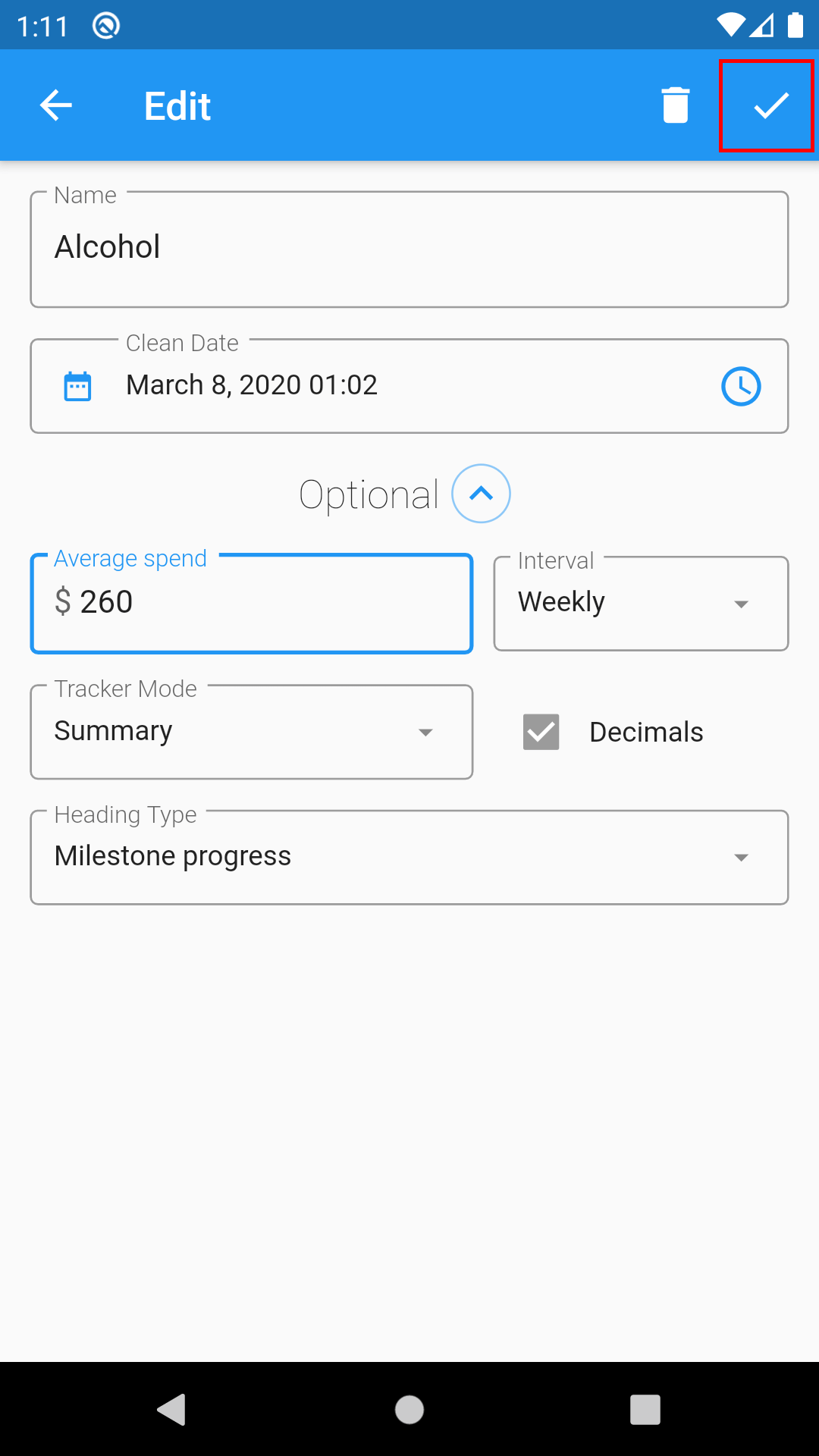1. On the Home page, choose the addiction that you want to have a savings tracker.