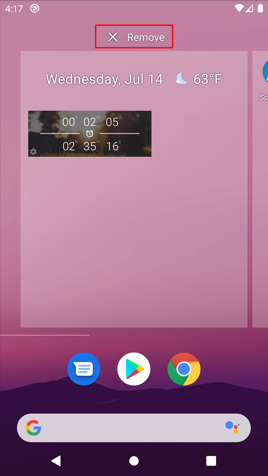 Note: Every version of Android appears to be a little different. On some Android devices, a close button or remove option will appear. Tapping it will remove the widget without dragging it.
