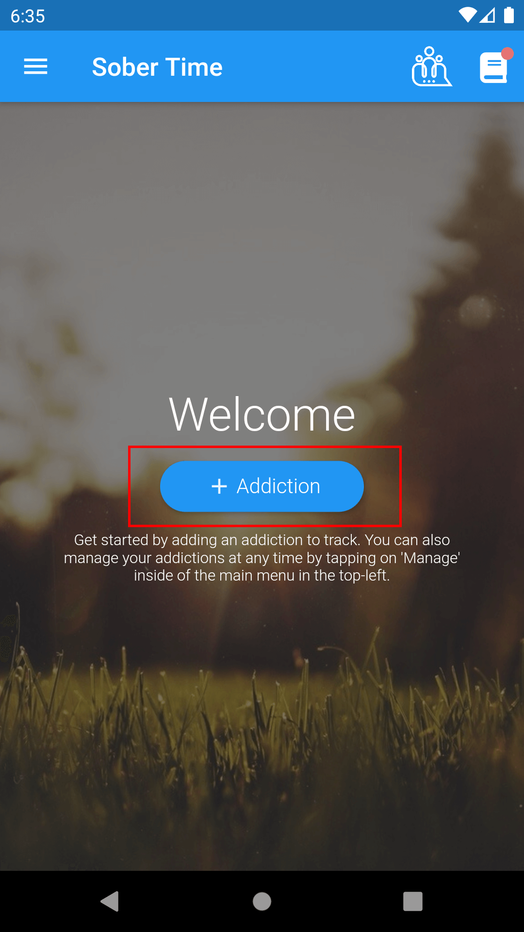 The home page is the first thing you'll see when opening Sober Time. You'll need to add at least one addiction to Sober Time. Let's get started.