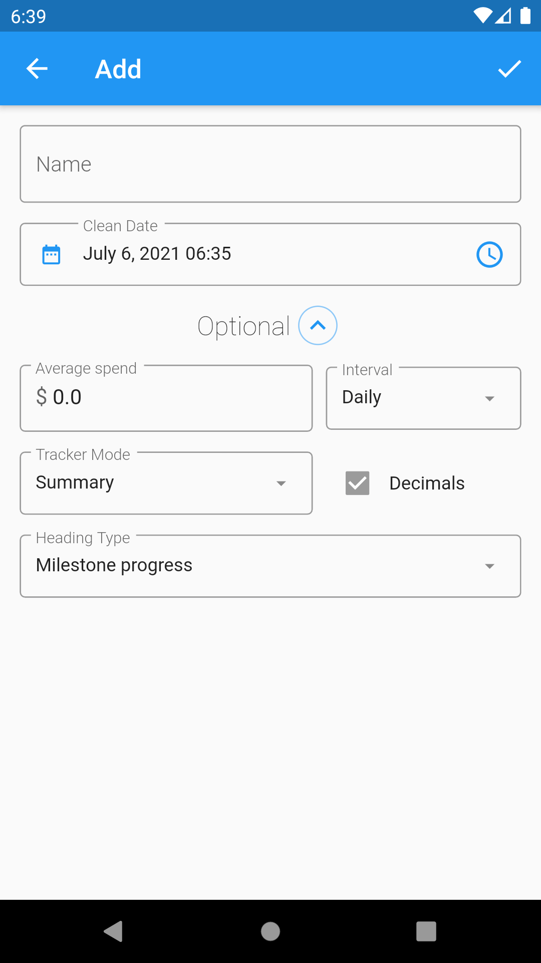 There are some optional settings and values that you can change by tapping the arrow button to expand the page. You can set them up now or come back and change them later. The default options are configured for an easy-to-use tracker.