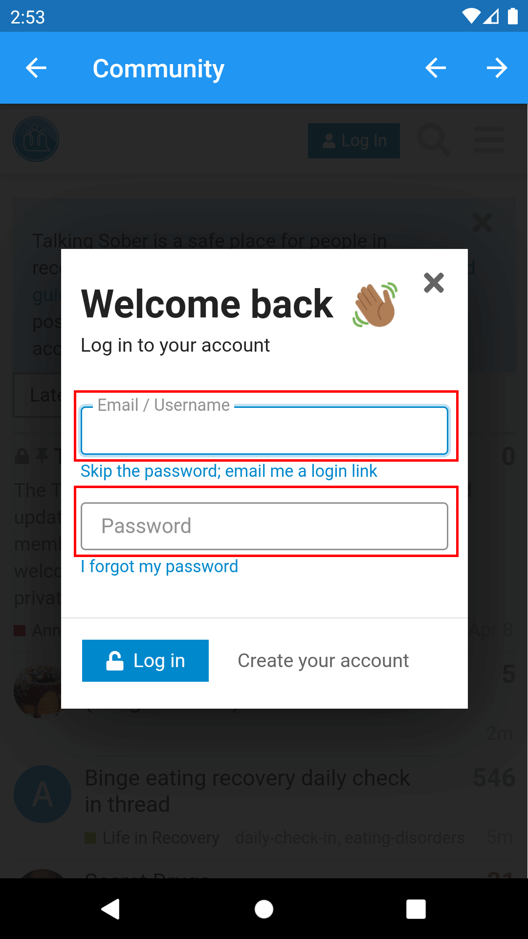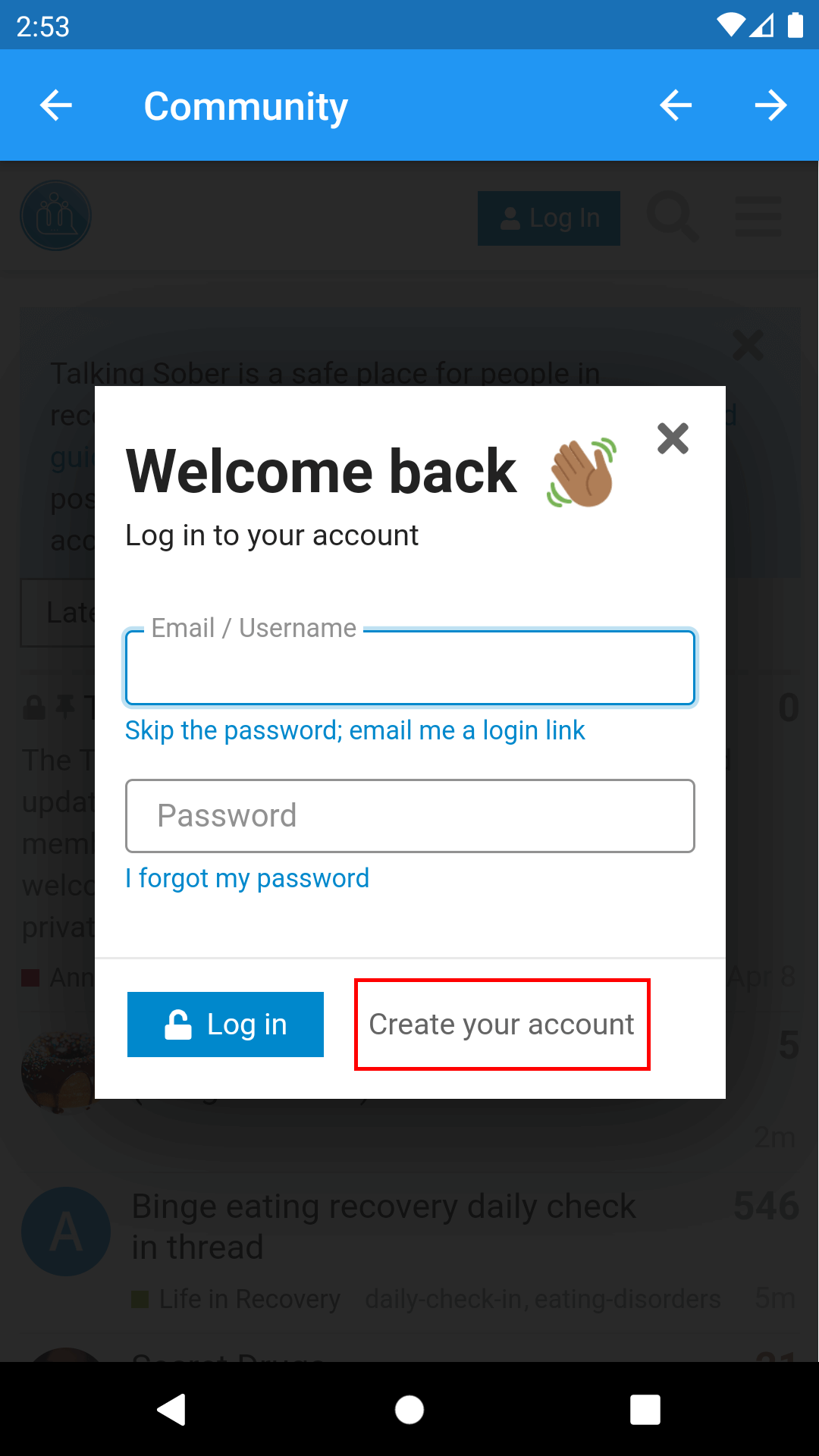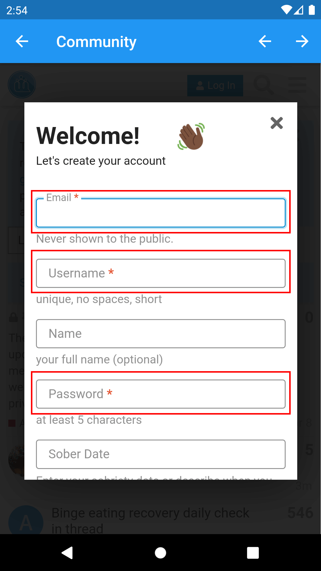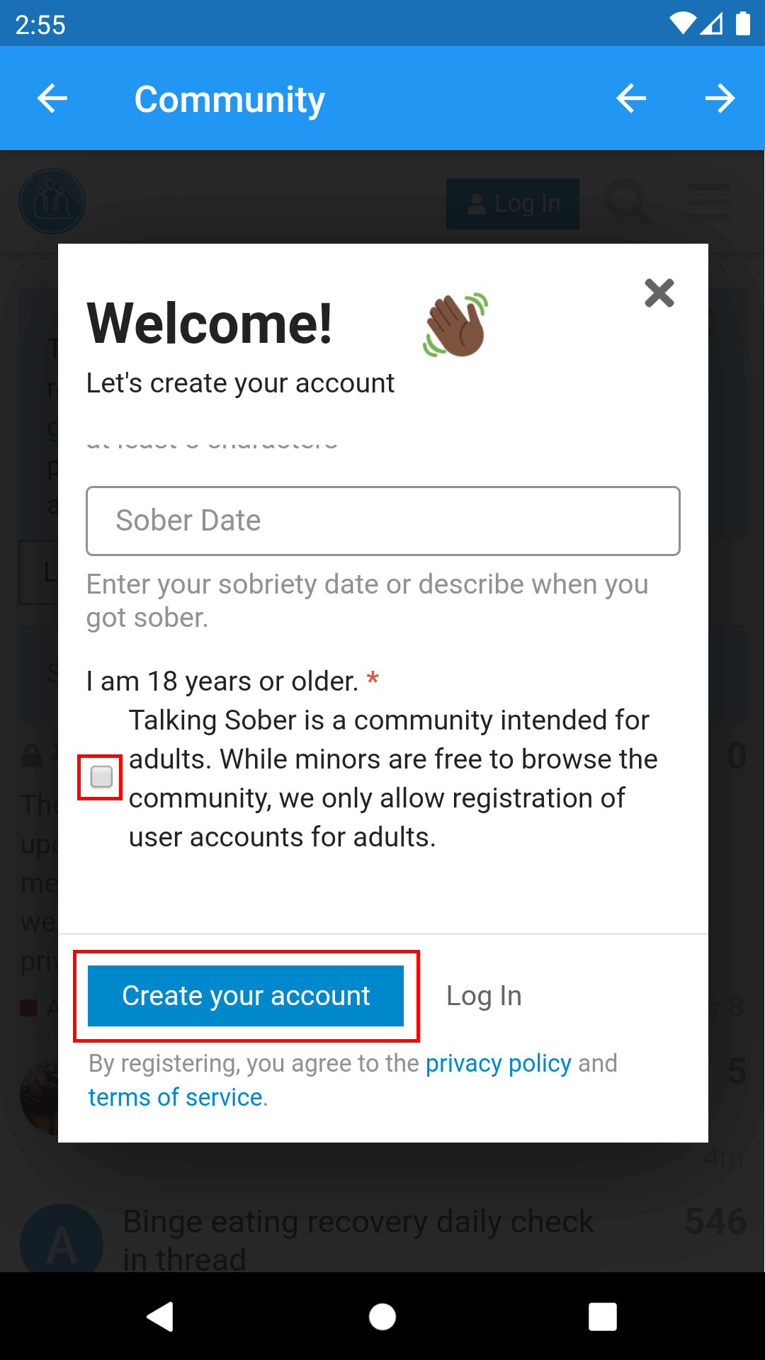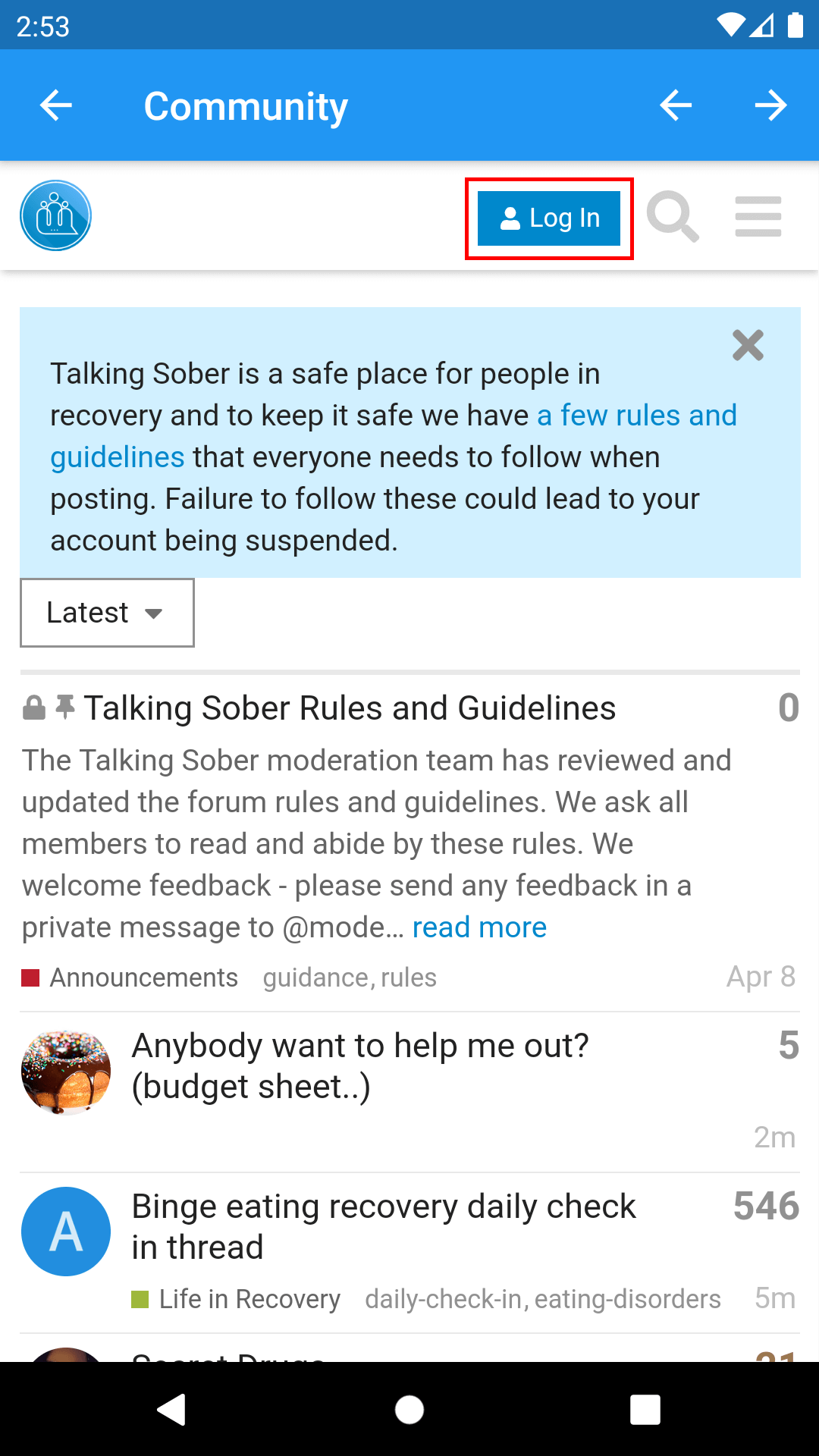 1. On the Home page of Sober Time, tap the Community button located in the top-right corner.