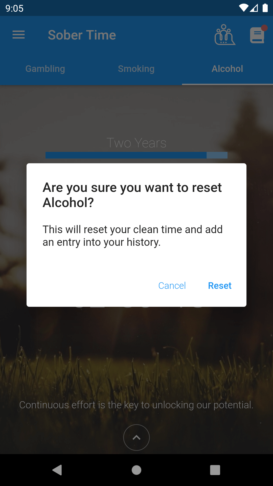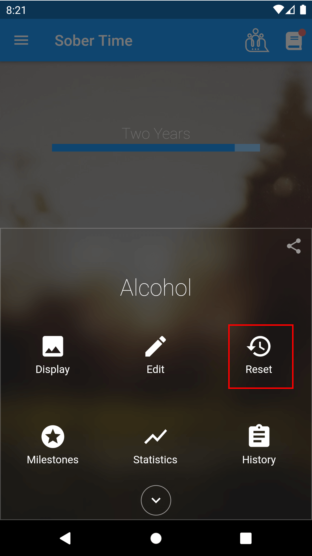 You can reset an addiction's Sober Time. This will set its clean date and time to the current date and time, creating a new entry in that addiction's history page. Resetting an addiction is mostly used for when you've relapsed.